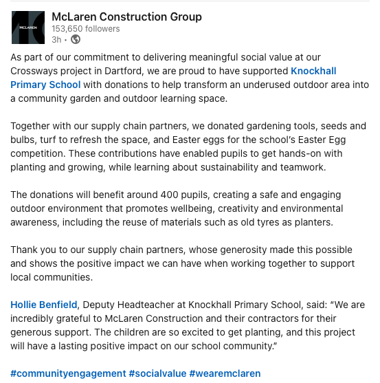 Knockhall Primary School have received generous support and donations to our school from McLaren Construction.